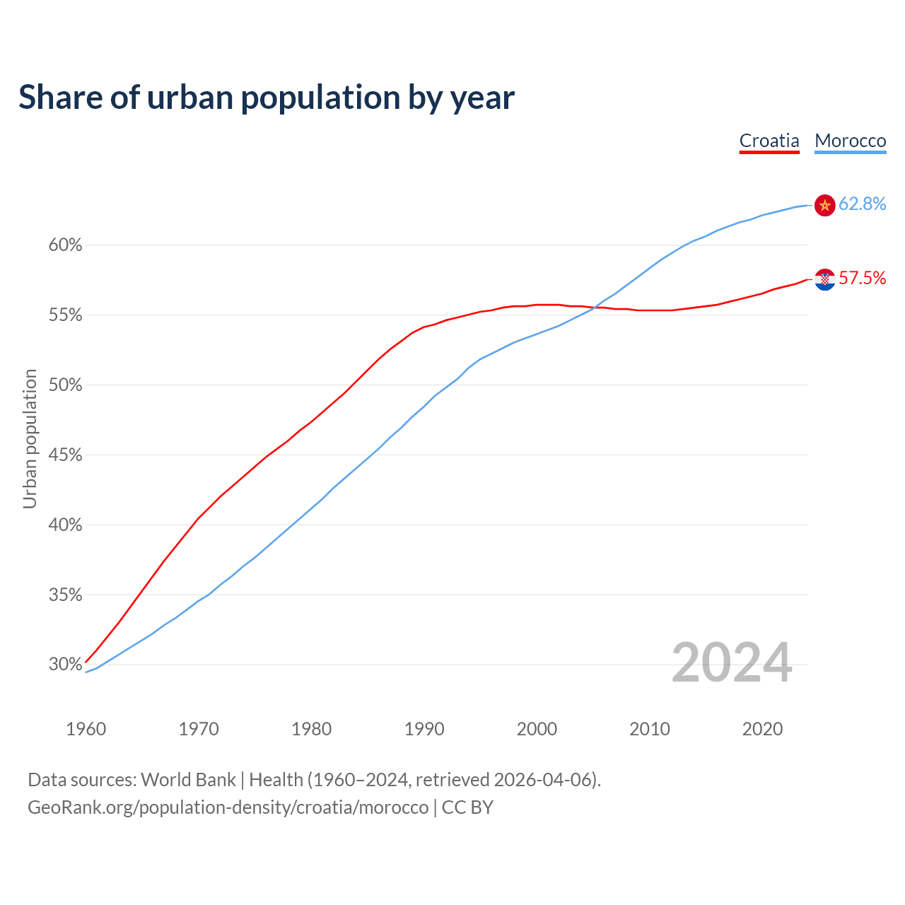 From 2004 to 2024, the share of urban population changed from 55.6% to 57.5% in Croatia and from 55% to 62.8% in Morocco.