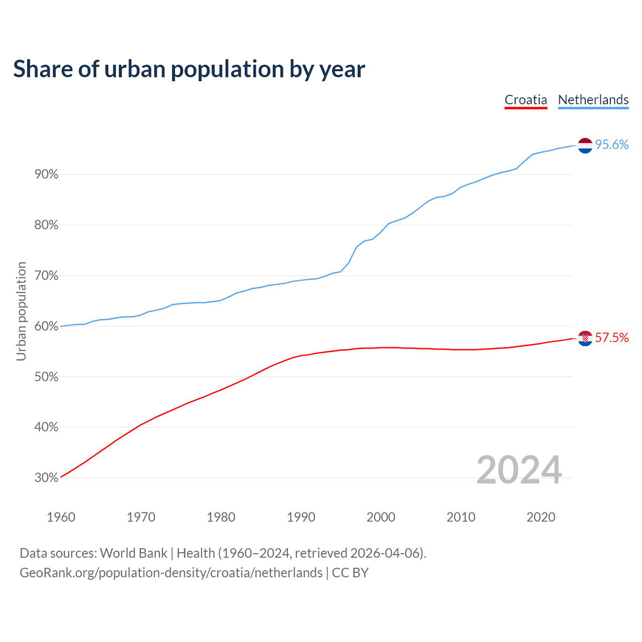 From 2004 to 2024, the share of urban population changed from 55.6% to 57.5% in Croatia and from 82.3% to 95.6% in the Netherlands.