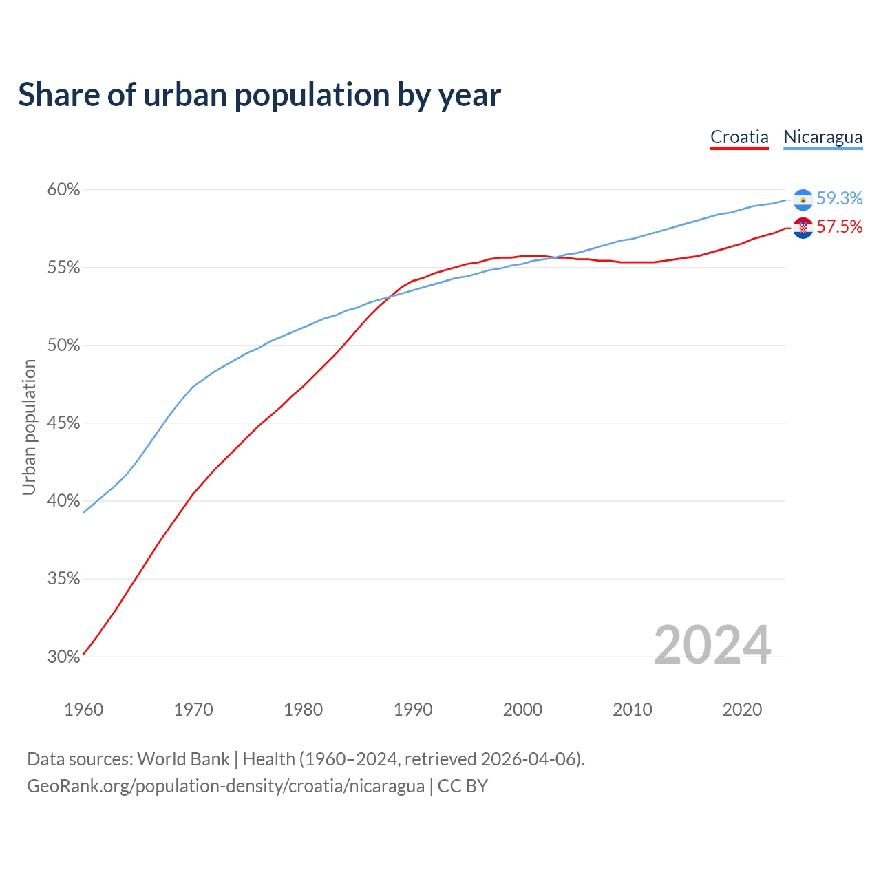 From 2004 to 2024, the share of urban population changed from 55.6% to 57.5% in Croatia and from 55.8% to 59.3% in Nicaragua.