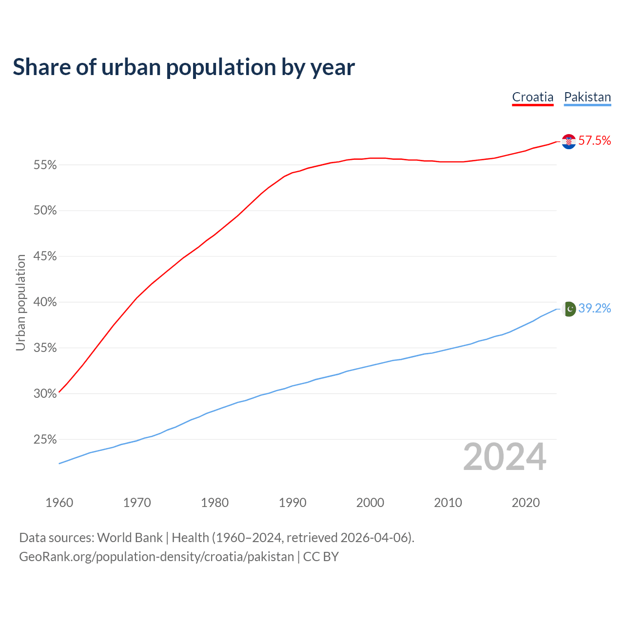 From 2004 to 2024, the share of urban population changed from 55.6% to 57.5% in Croatia and from 33.7% to 39.2% in Pakistan.