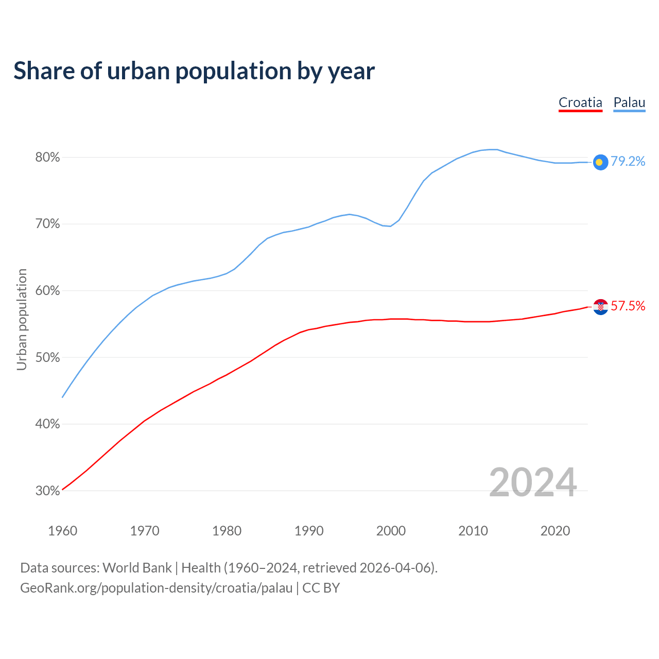 From 2004 to 2024, the share of urban population changed from 55.6% to 57.5% in Croatia and from 76.4% to 79.2% in Palau.
