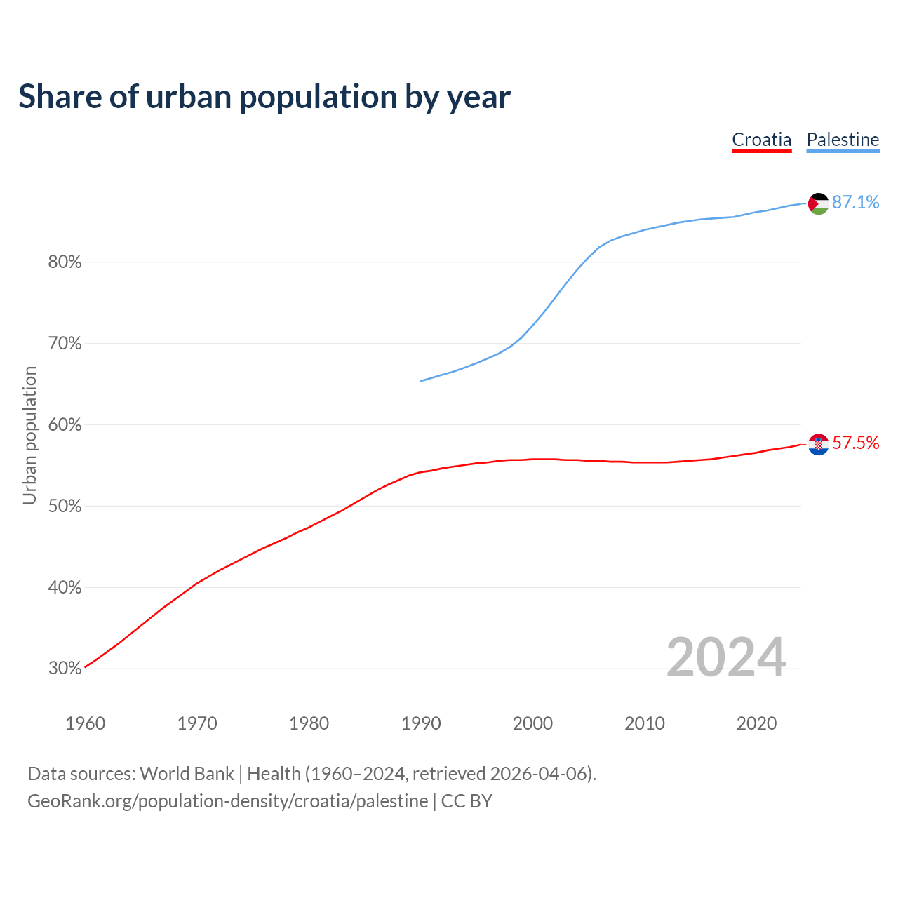 From 2004 to 2024, the share of urban population changed from 55.6% to 57.5% in Croatia and from 79% to 87.1% in Palestine.