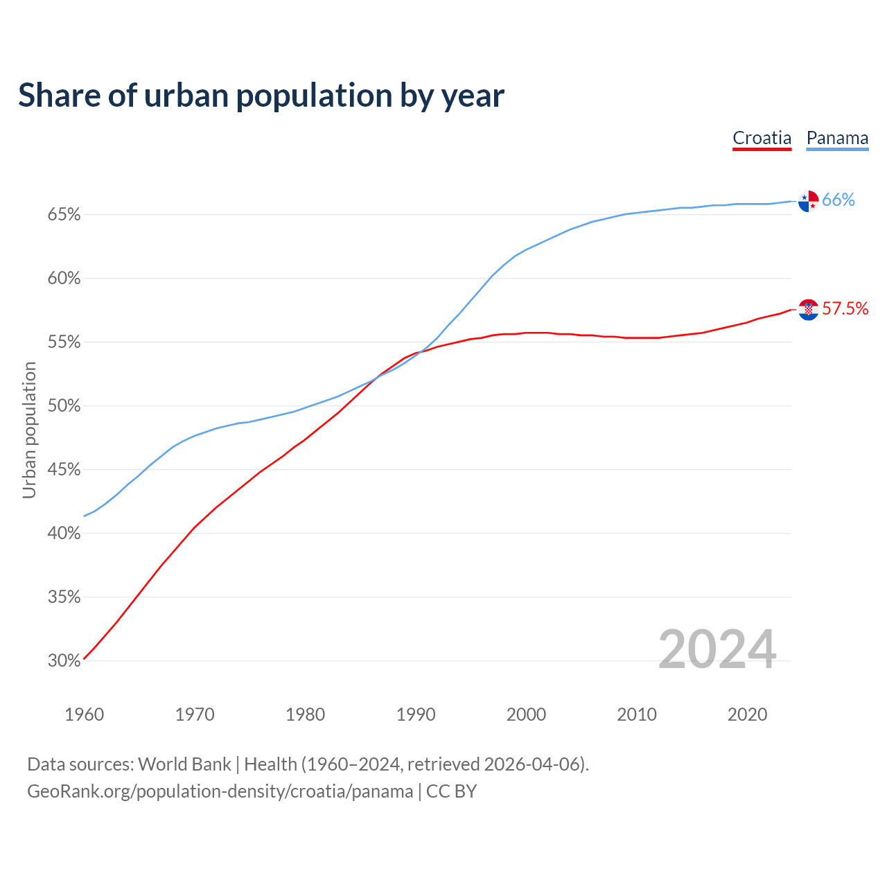 From 2004 to 2024, the share of urban population changed from 55.6% to 57.5% in Croatia and from 63.8% to 66% in Panama.