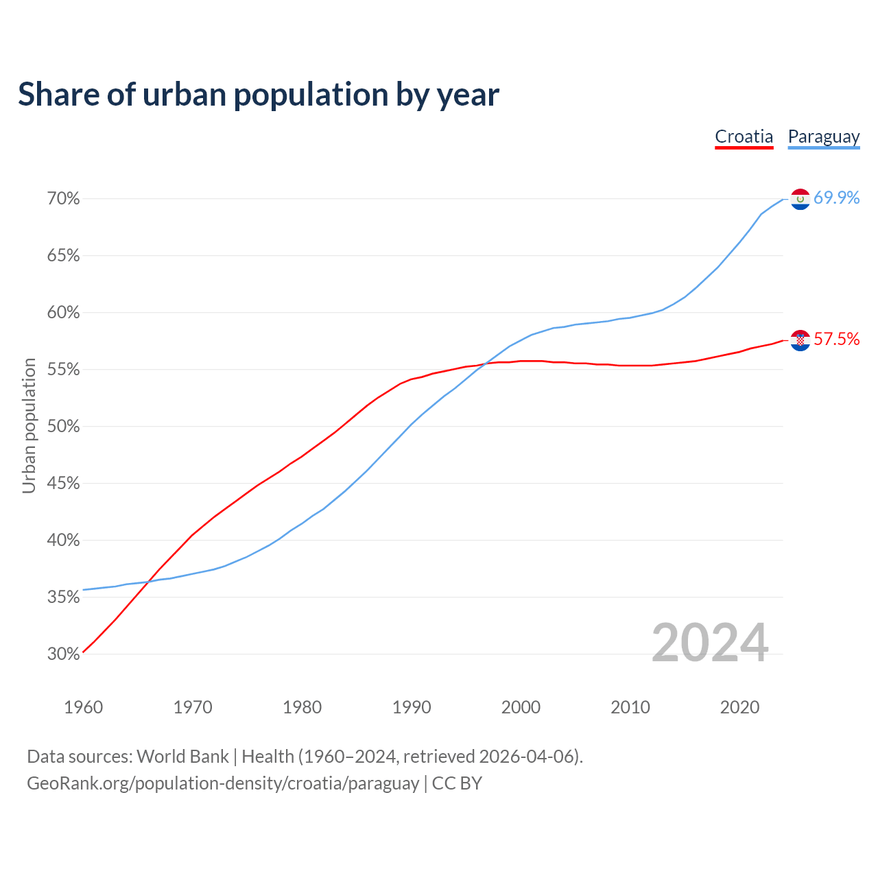 From 2004 to 2024, the share of urban population changed from 55.6% to 57.5% in Croatia and from 58.7% to 69.9% in Paraguay.