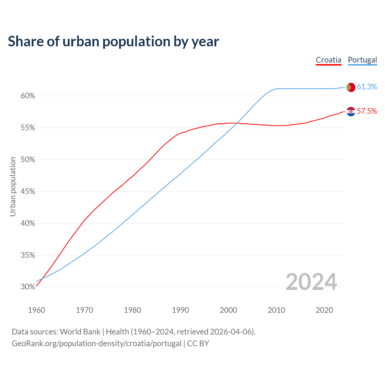 From 2004 to 2024, the share of urban population changed from 55.6% to 57.5% in Croatia and from 57.4% to 61.3% in Portugal.