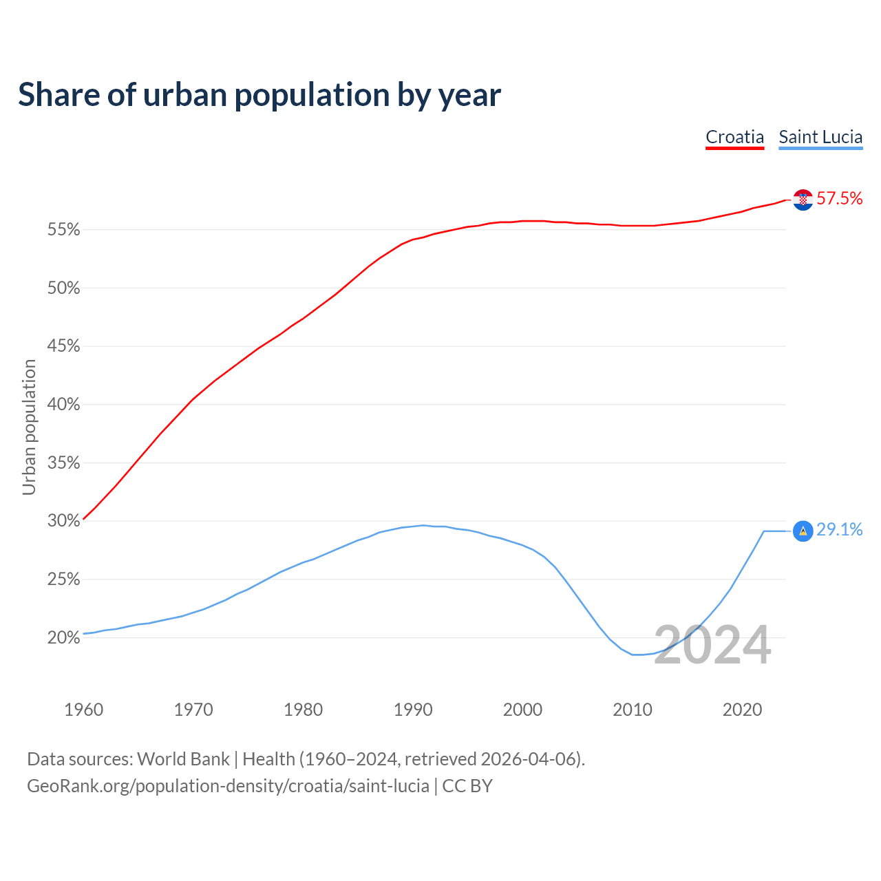 From 2004 to 2024, the share of urban population changed from 55.6% to 57.5% in Croatia and from 24.8% to 29.1% in Saint Lucia.