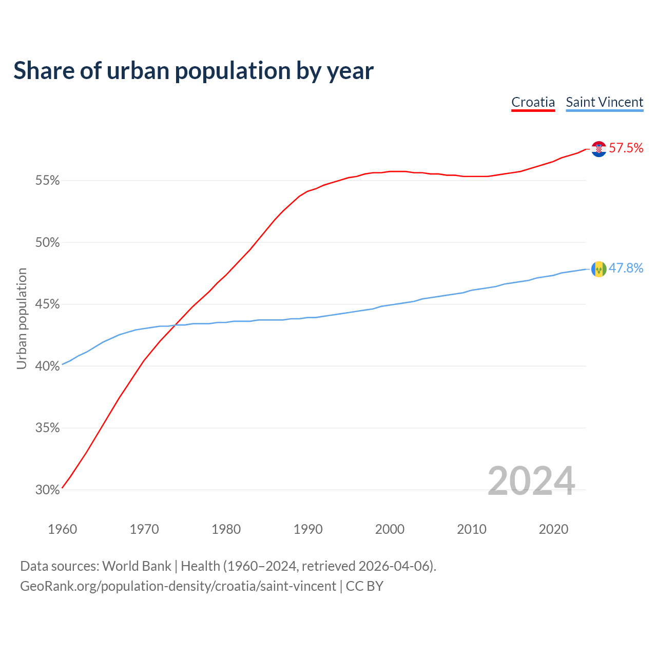 From 2004 to 2024, the share of urban population changed from 55.6% to 57.5% in Croatia and from 45.4% to 47.8% in Saint Vincent.