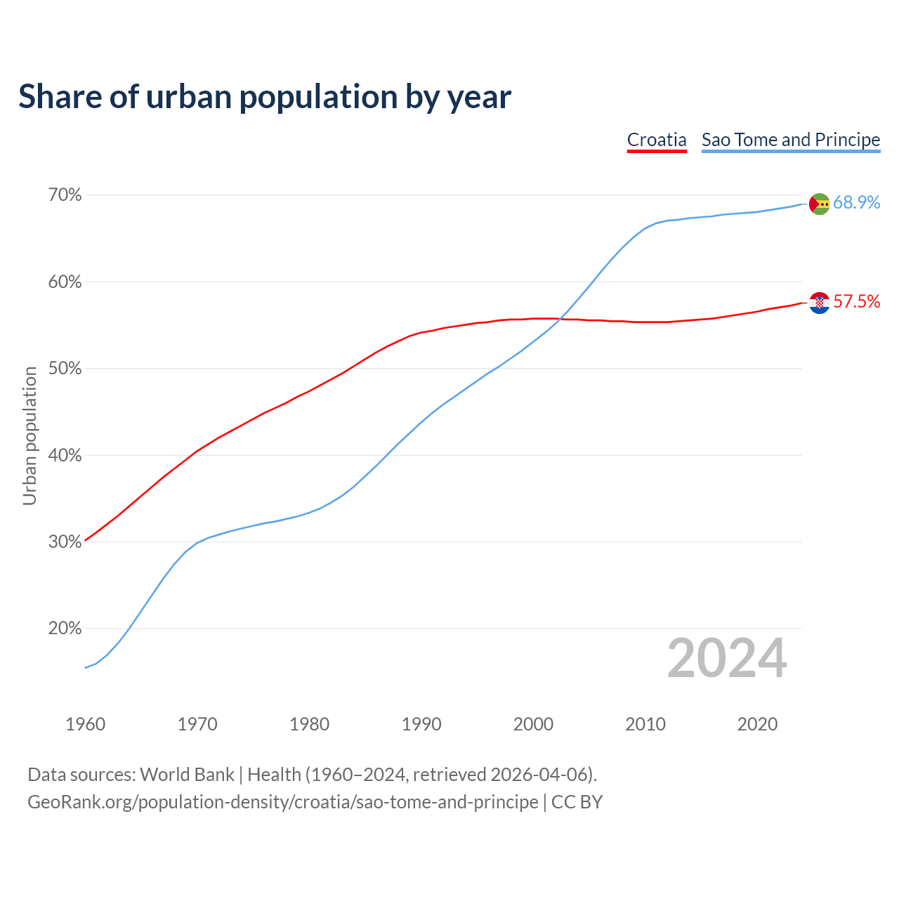 From 2004 to 2024, the share of urban population changed from 55.6% to 57.5% in Croatia and from 57.9% to 68.9% in Sao Tome and Principe.
