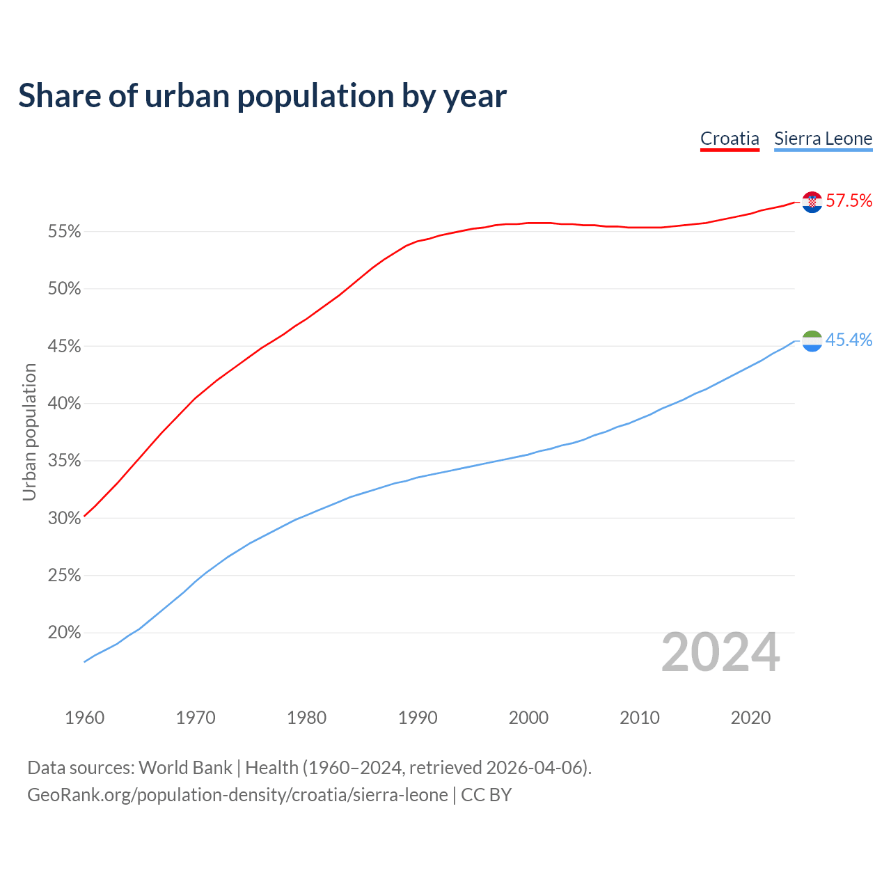 From 2004 to 2024, the share of urban population changed from 55.6% to 57.5% in Croatia and from 36.5% to 45.4% in Sierra Leone.