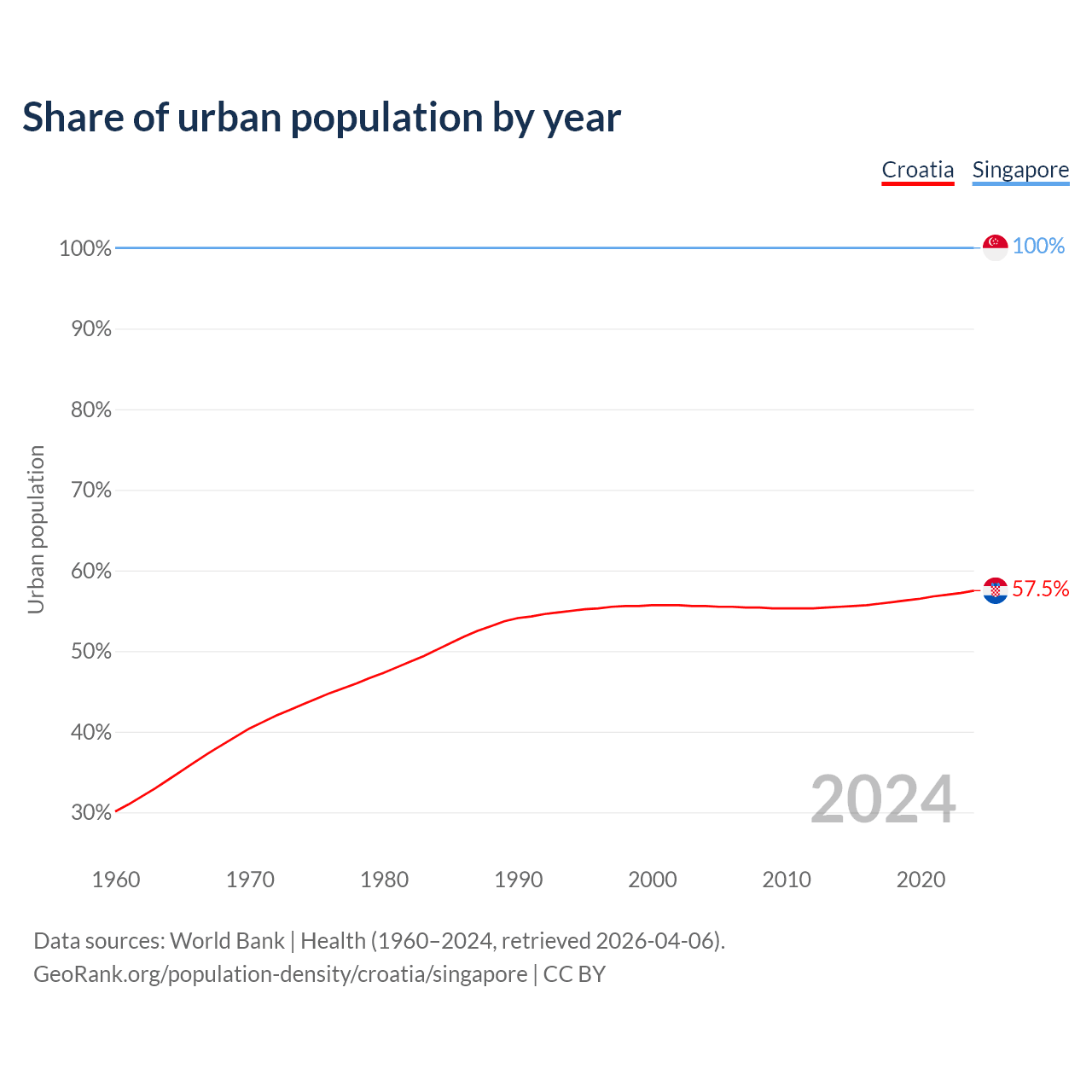 From 2004 to 2024, the share of urban population changed from 55.6% to 57.5% in Croatia and from 100% to 100% in Singapore.