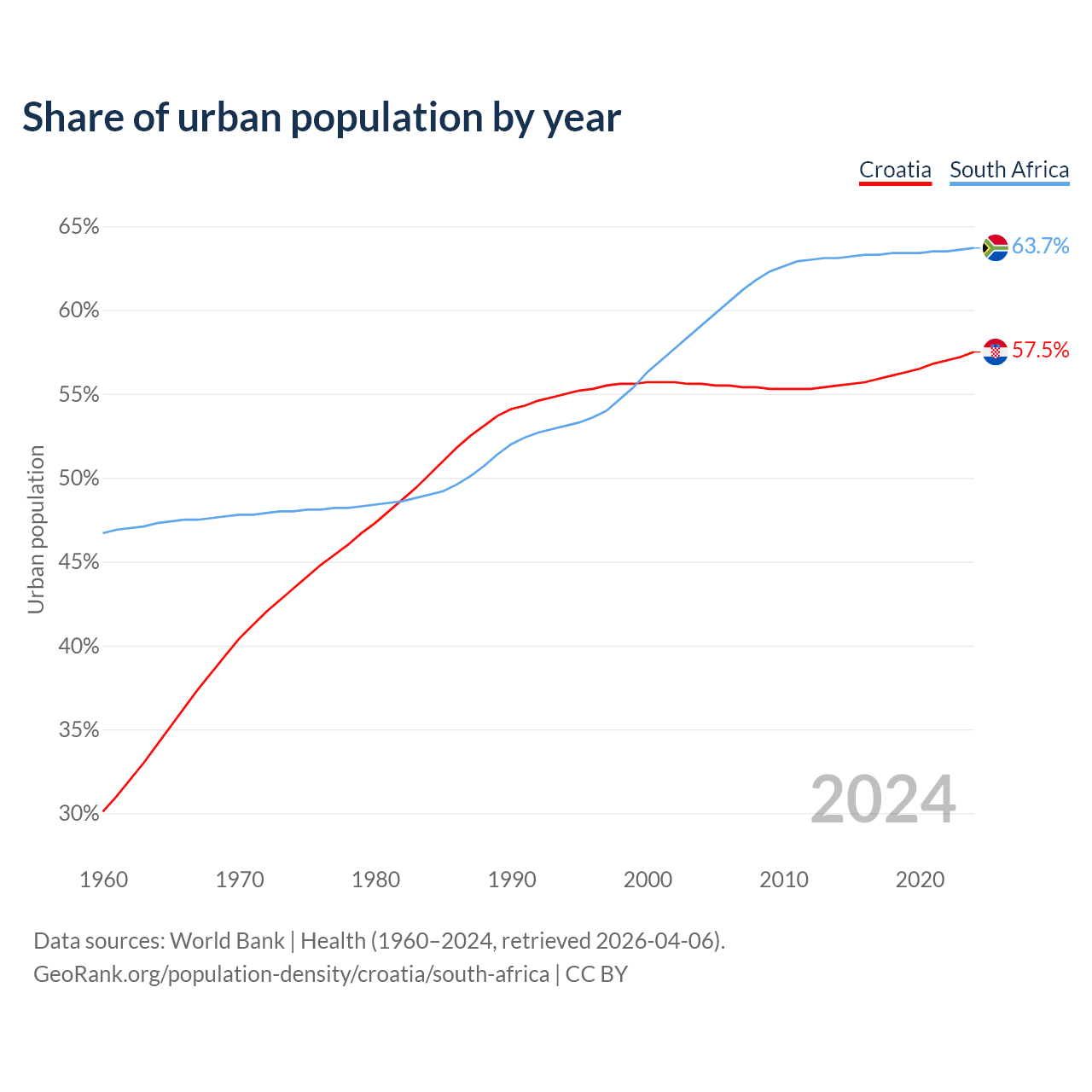 From 2004 to 2024, the share of urban population changed from 55.6% to 57.5% in Croatia and from 59.1% to 63.7% in South Africa.