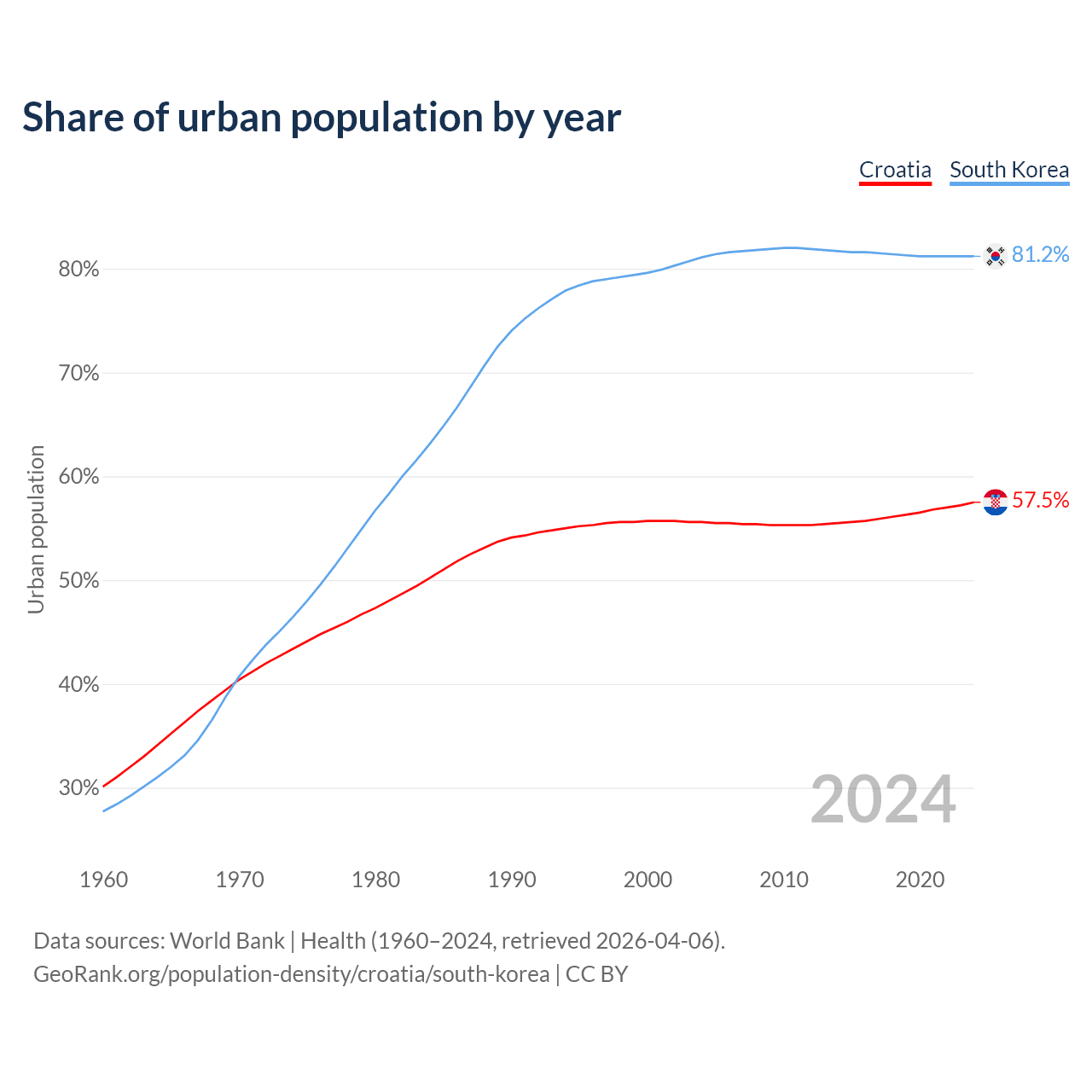 From 2004 to 2024, the share of urban population changed from 55.6% to 57.5% in Croatia and from 81.1% to 81.2% in South Korea.