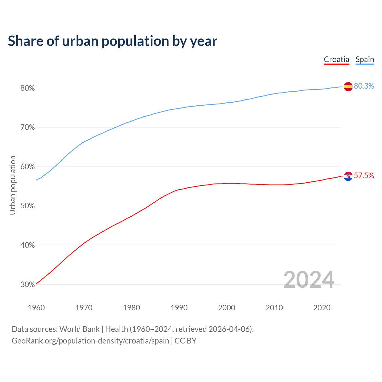 From 2004 to 2024, the share of urban population changed from 55.6% to 57.5% in Croatia and from 77% to 80.3% in Spain.