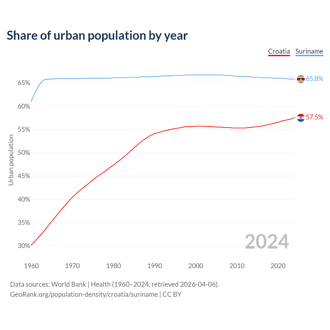 From 2004 to 2024, the share of urban population changed from 55.6% to 57.5% in Croatia and from 66.7% to 65.8% in Suriname.