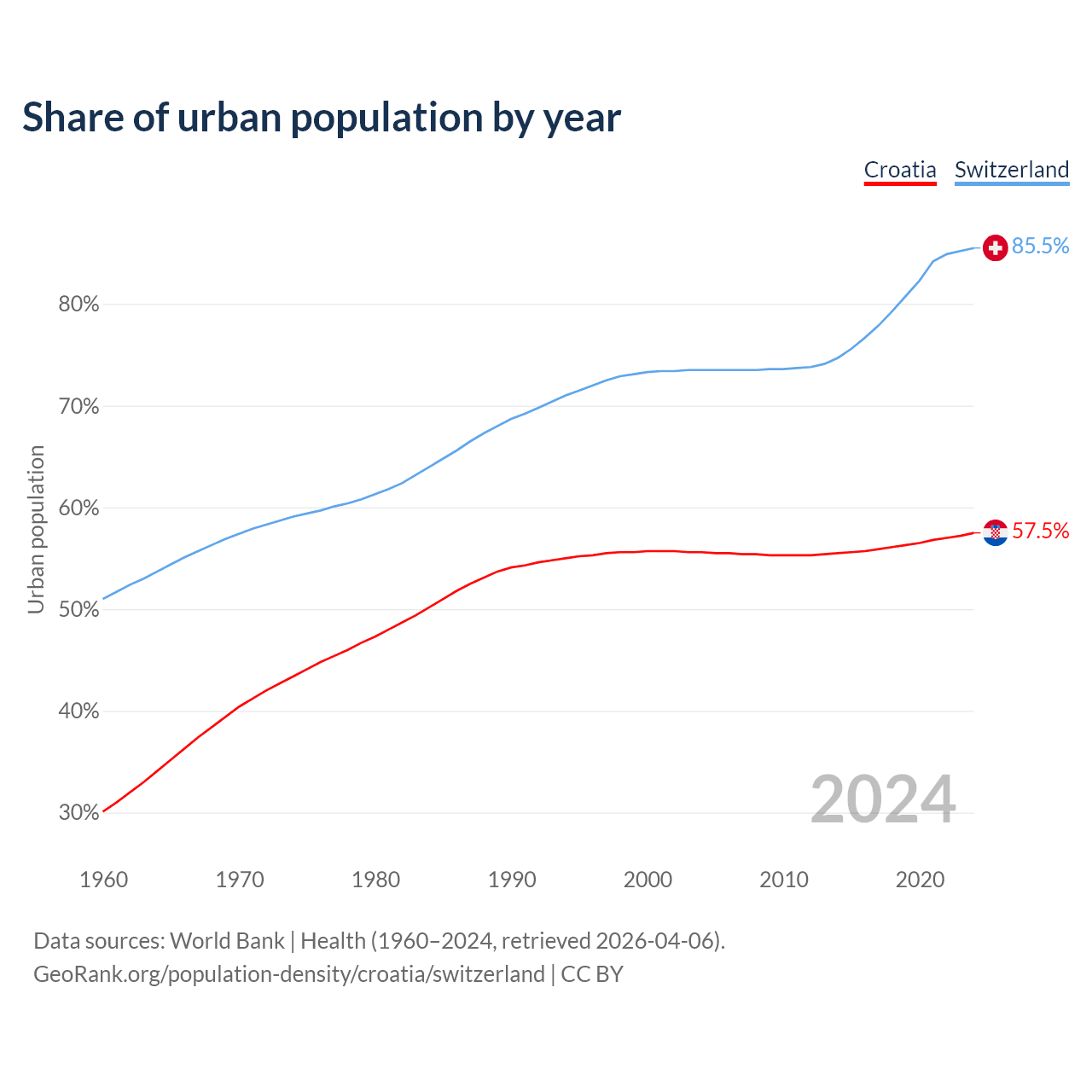 From 2004 to 2024, the share of urban population changed from 55.6% to 57.5% in Croatia and from 73.5% to 85.5% in Switzerland.
