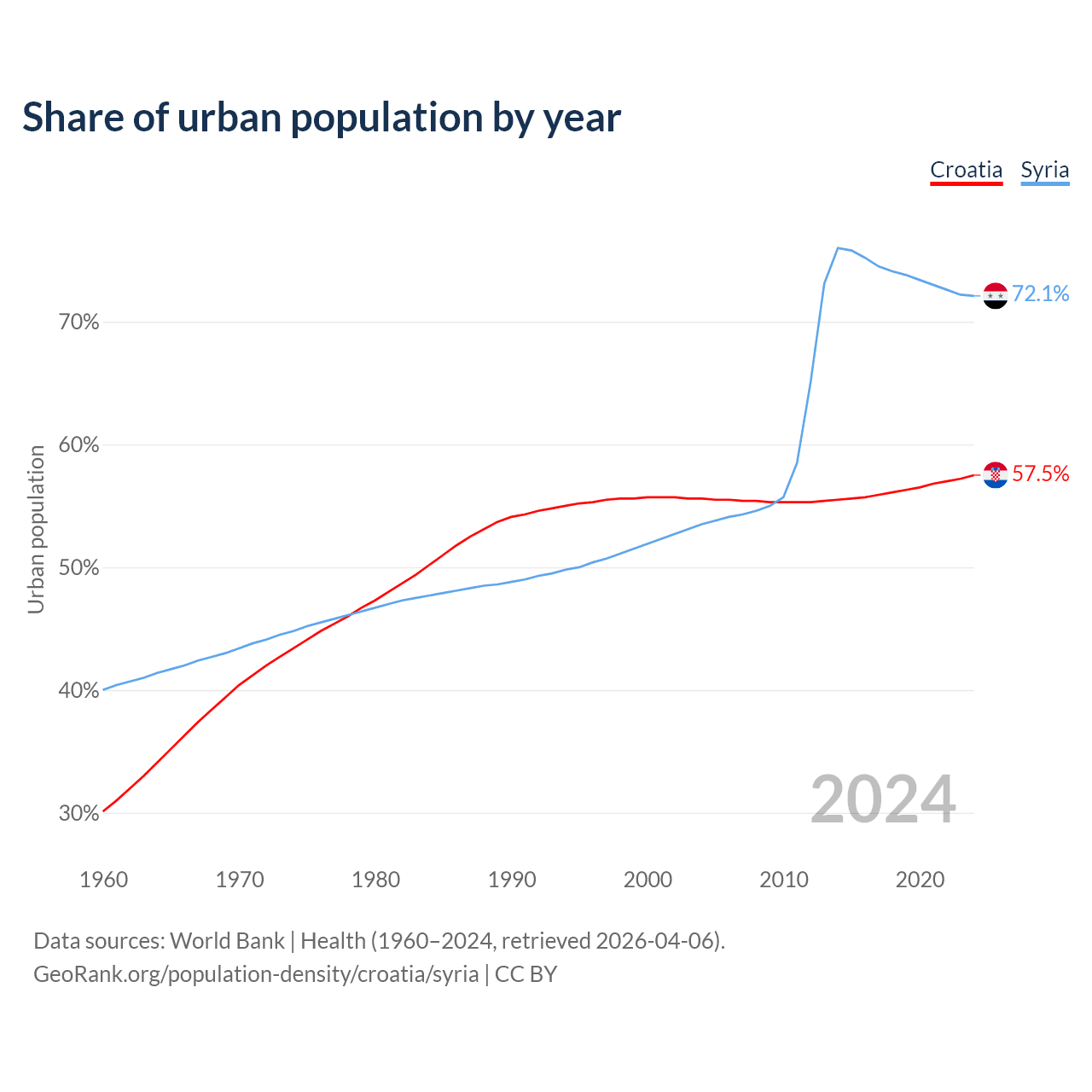 From 2004 to 2024, the share of urban population changed from 55.6% to 57.5% in Croatia and from 53.5% to 72.1% in Syria.