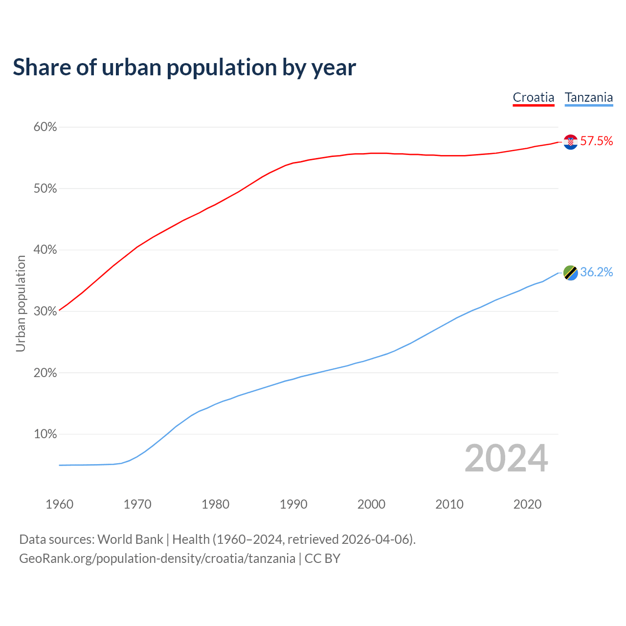 From 2004 to 2024, the share of urban population changed from 55.6% to 57.5% in Croatia and from 24.1% to 36.2% in Tanzania.