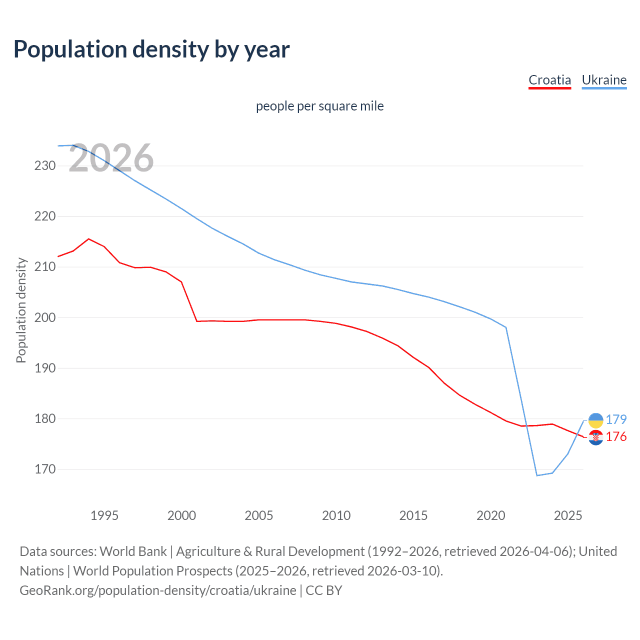 From 2006 to 2026, population density in Croatia decreased by 11.6%, compared to a 15.1% decline in Ukraine.