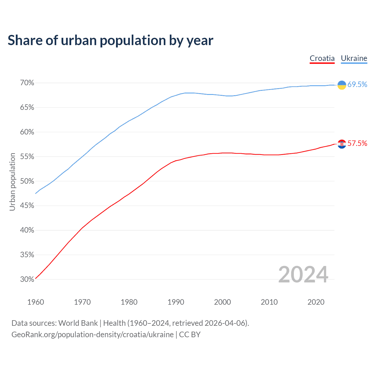 From 2004 to 2024, the share of urban population changed from 55.6% to 57.5% in Croatia and from 67.6% to 69.5% in Ukraine.