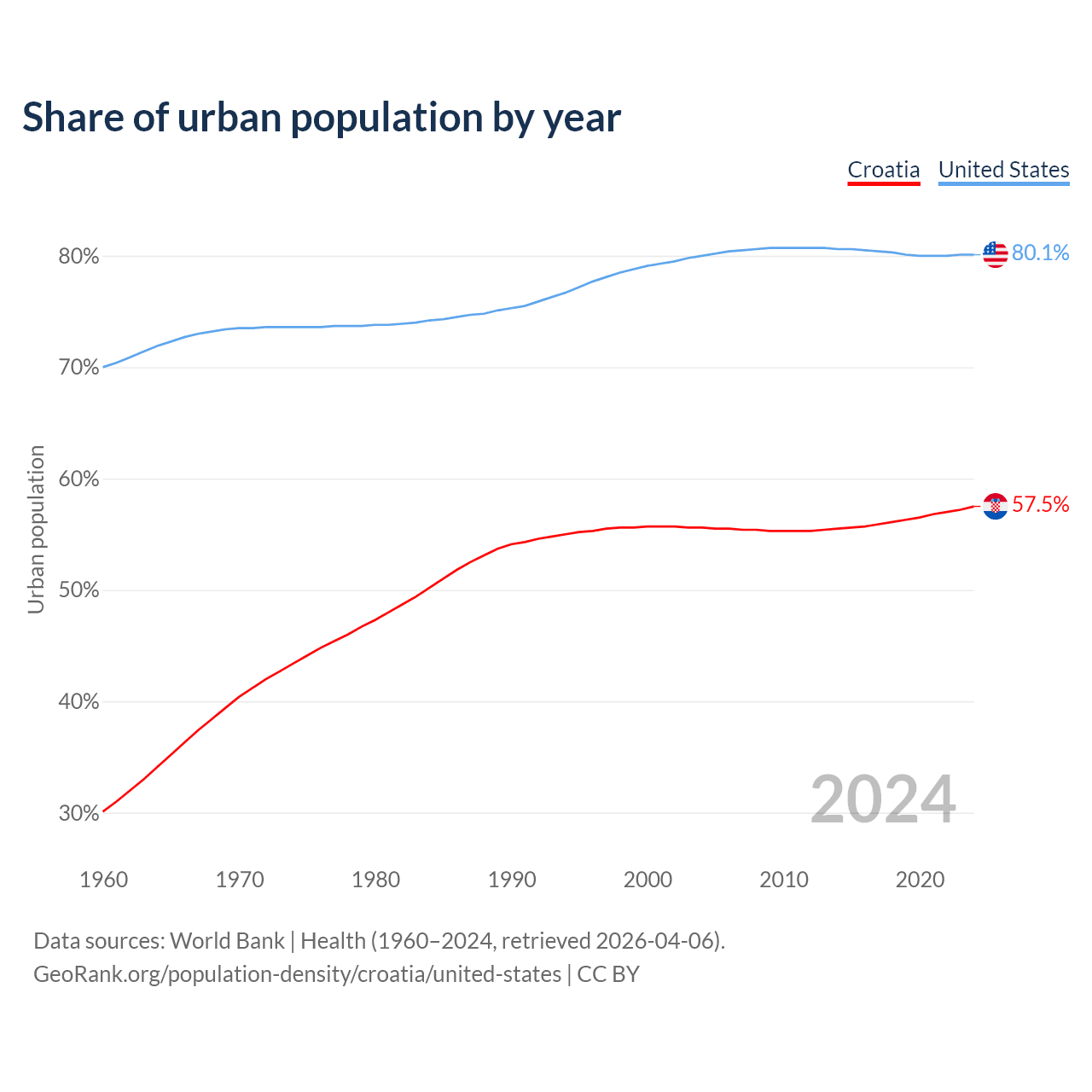From 2004 to 2024, the share of urban population changed from 55.6% to 57.5% in Croatia and from 80% to 80.1% in the United States.