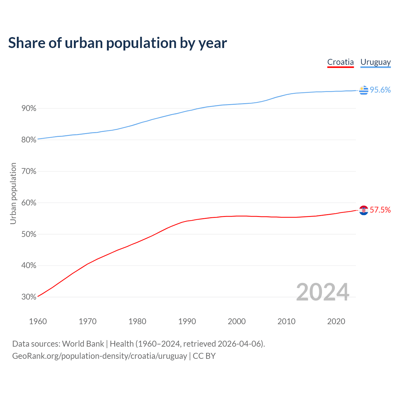 From 2004 to 2024, the share of urban population changed from 55.6% to 57.5% in Croatia and from 91.8% to 95.6% in Uruguay.