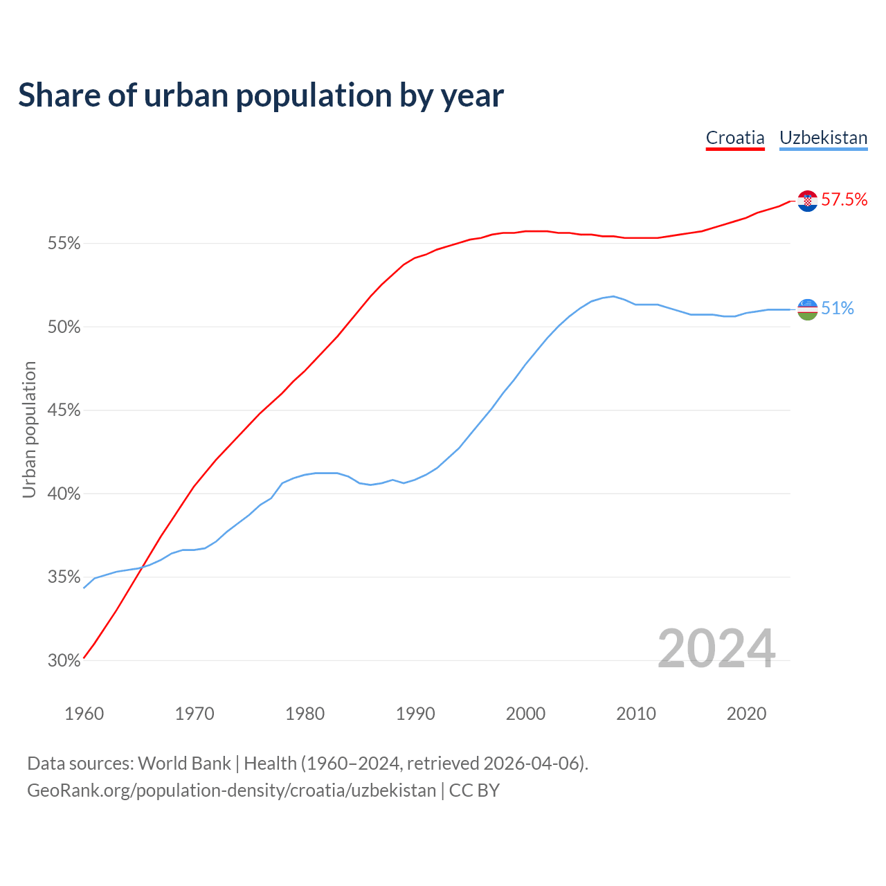 From 2004 to 2024, the share of urban population changed from 55.6% to 57.5% in Croatia and from 50.6% to 51% in Uzbekistan.