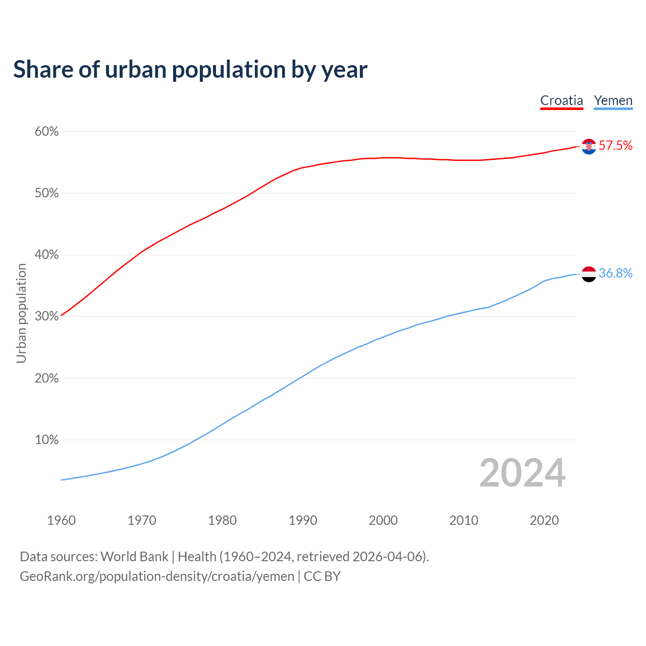 From 2004 to 2024, the share of urban population changed from 55.6% to 57.5% in Croatia and from 28.5% to 36.8% in Yemen.