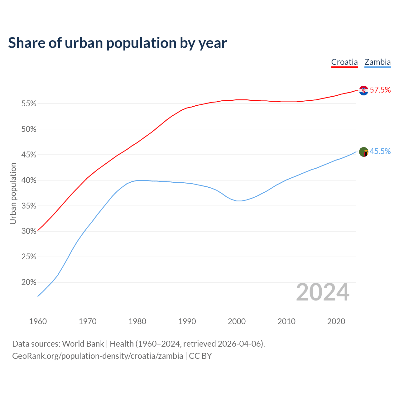 From 2004 to 2024, the share of urban population changed from 55.6% to 57.5% in Croatia and from 36.8% to 45.5% in Zambia.