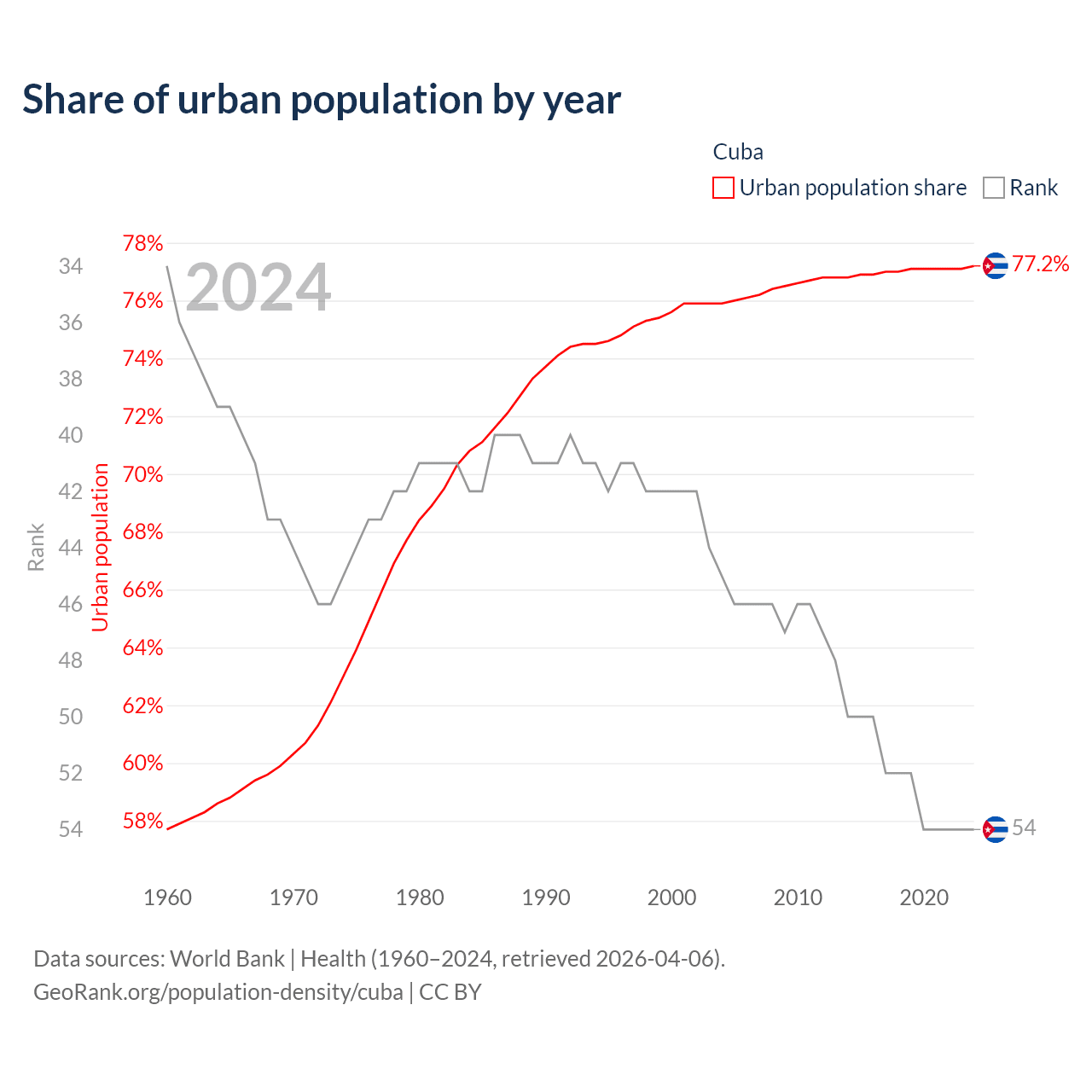 This chart shows the share of urban population in Cuba from 1960 to 2024: 57.7% lived in urban areas in 1960, 75.6% in 2000, and 77.2% in 2024.