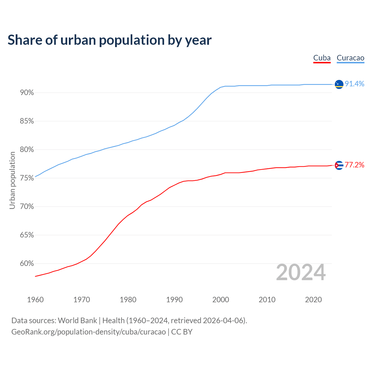 From 2004 to 2024, the share of urban population changed from 75.9% to 77.2% in Cuba and from 91.2% to 91.4% in Curacao.