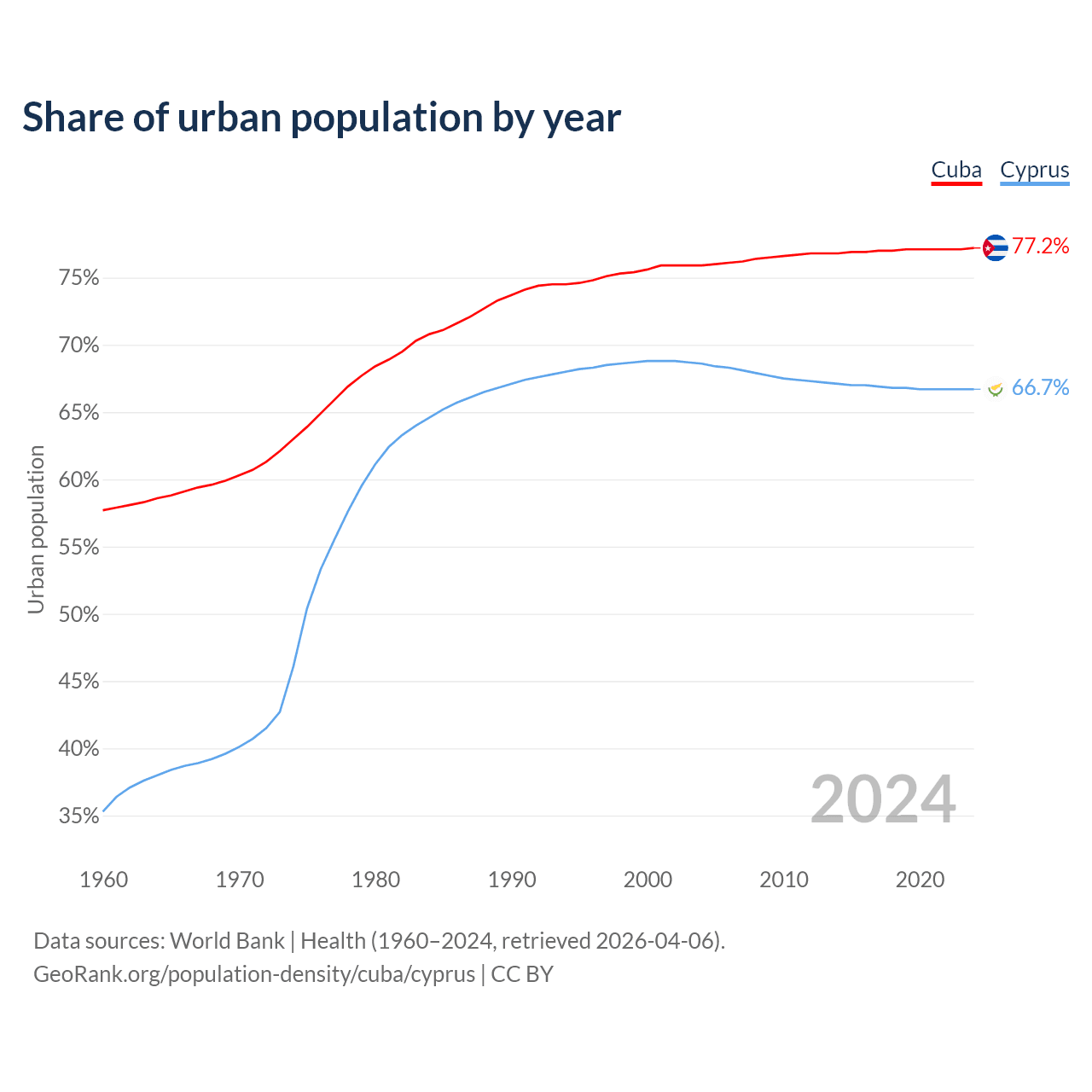 From 2004 to 2024, the share of urban population changed from 75.9% to 77.2% in Cuba and from 68.6% to 66.7% in Cyprus.