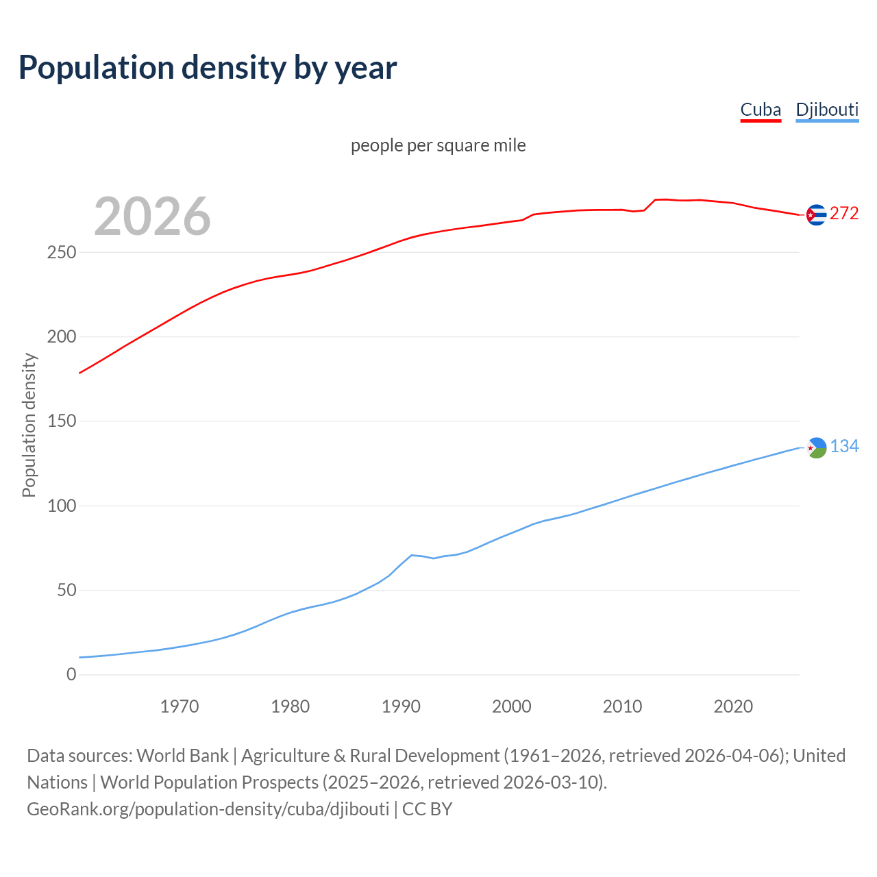 From 2006 to 2026, population density in Cuba decreased by 0.96%, compared to a 40.2% growth in Djibouti.