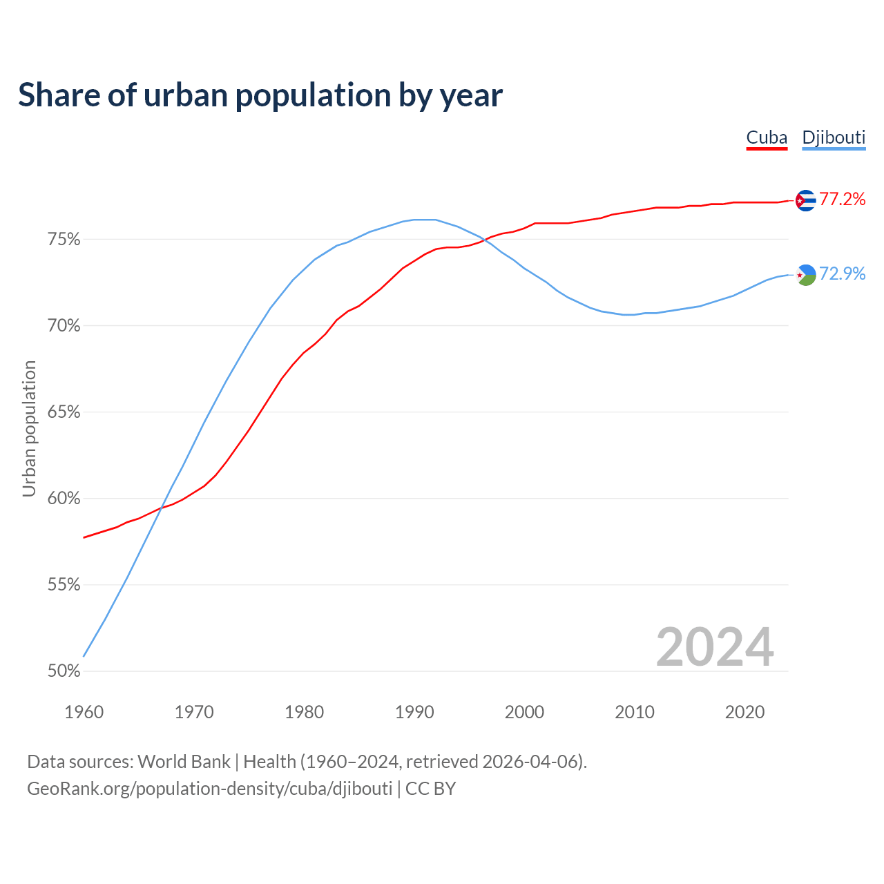 From 2004 to 2024, the share of urban population changed from 75.9% to 77.2% in Cuba and from 71.6% to 72.9% in Djibouti.
