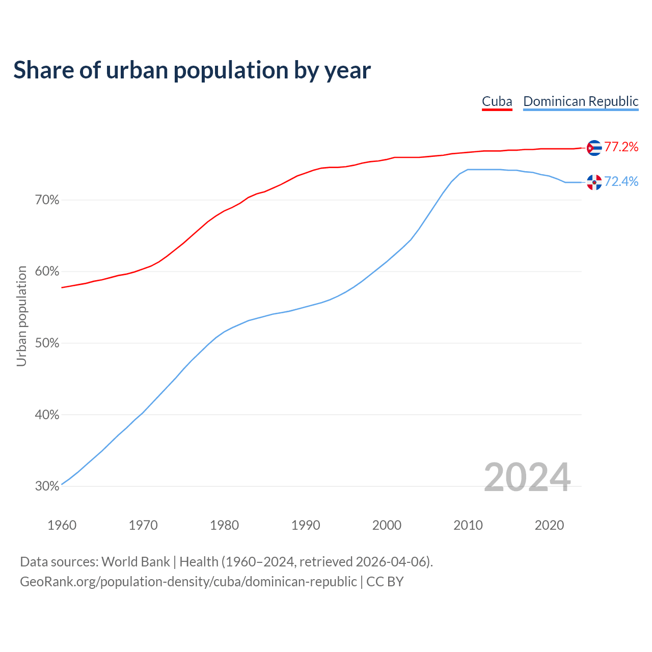 From 2004 to 2024, the share of urban population changed from 75.9% to 77.2% in Cuba and from 65.9% to 72.4% in the Dominican Republic.