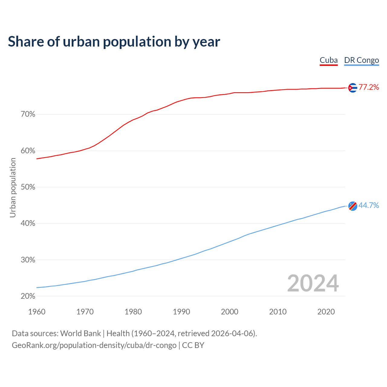 From 2004 to 2024, the share of urban population changed from 75.9% to 77.2% in Cuba and from 37% to 44.7% in the DR Congo.