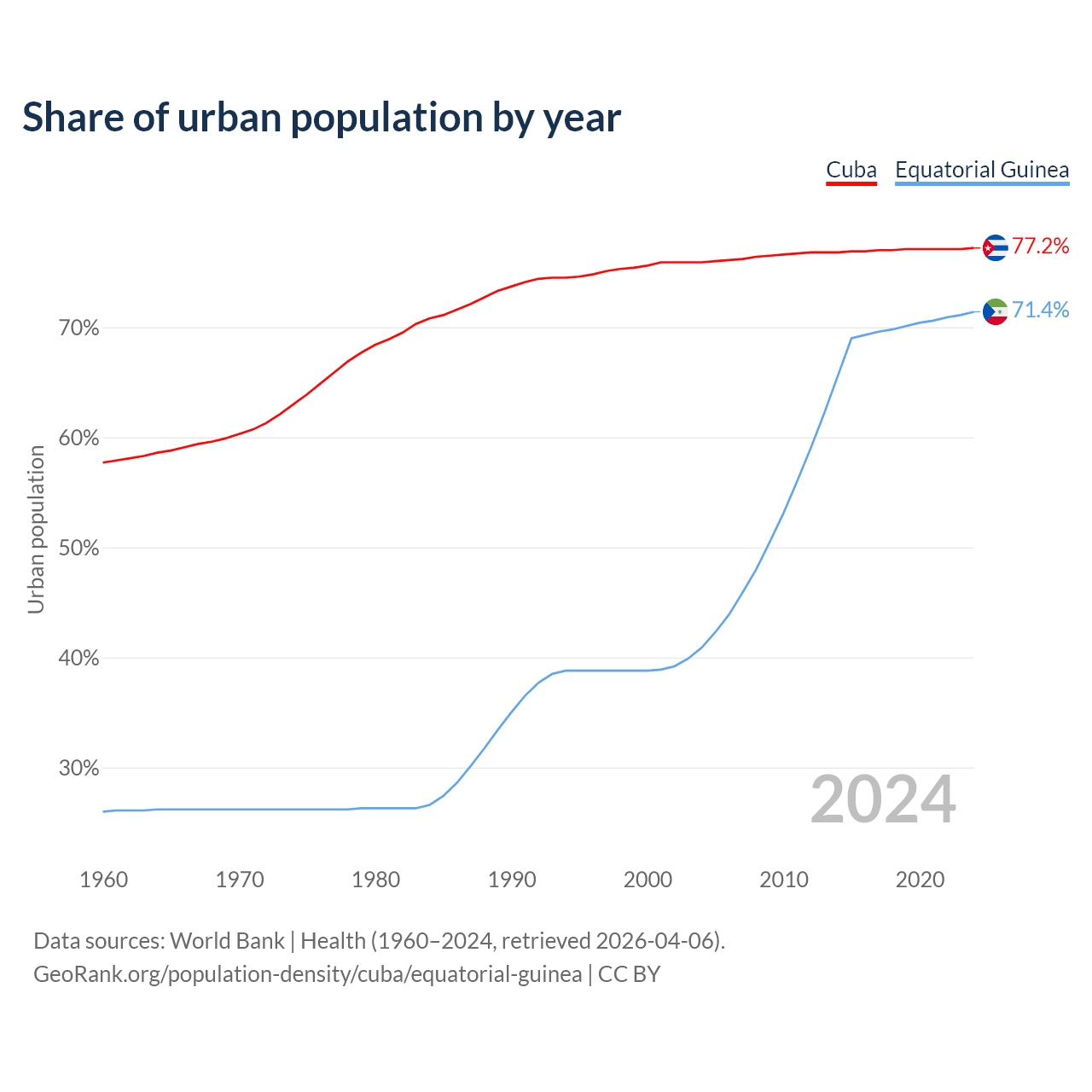 From 2004 to 2024, the share of urban population changed from 75.9% to 77.2% in Cuba and from 40.9% to 71.4% in Equatorial Guinea.