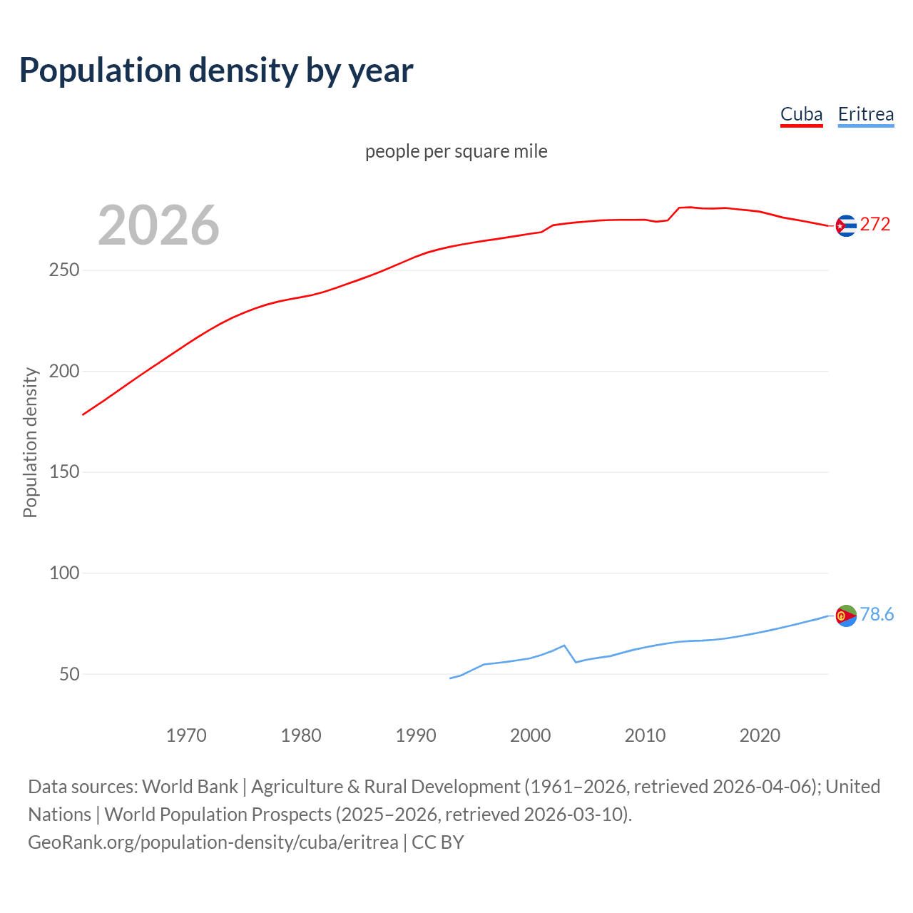 From 2006 to 2026, population density in Cuba decreased by 0.96%, compared to a 35.9% growth in Eritrea.