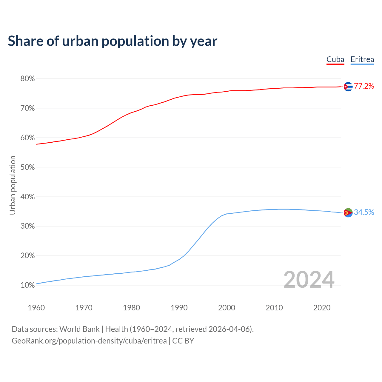From 2004 to 2024, the share of urban population changed from 75.9% to 77.2% in Cuba and from 34.9% to 34.5% in Eritrea.
