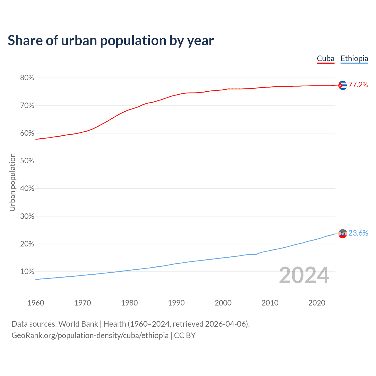 From 2004 to 2024, the share of urban population changed from 75.9% to 77.2% in Cuba and from 15.8% to 23.6% in Ethiopia.