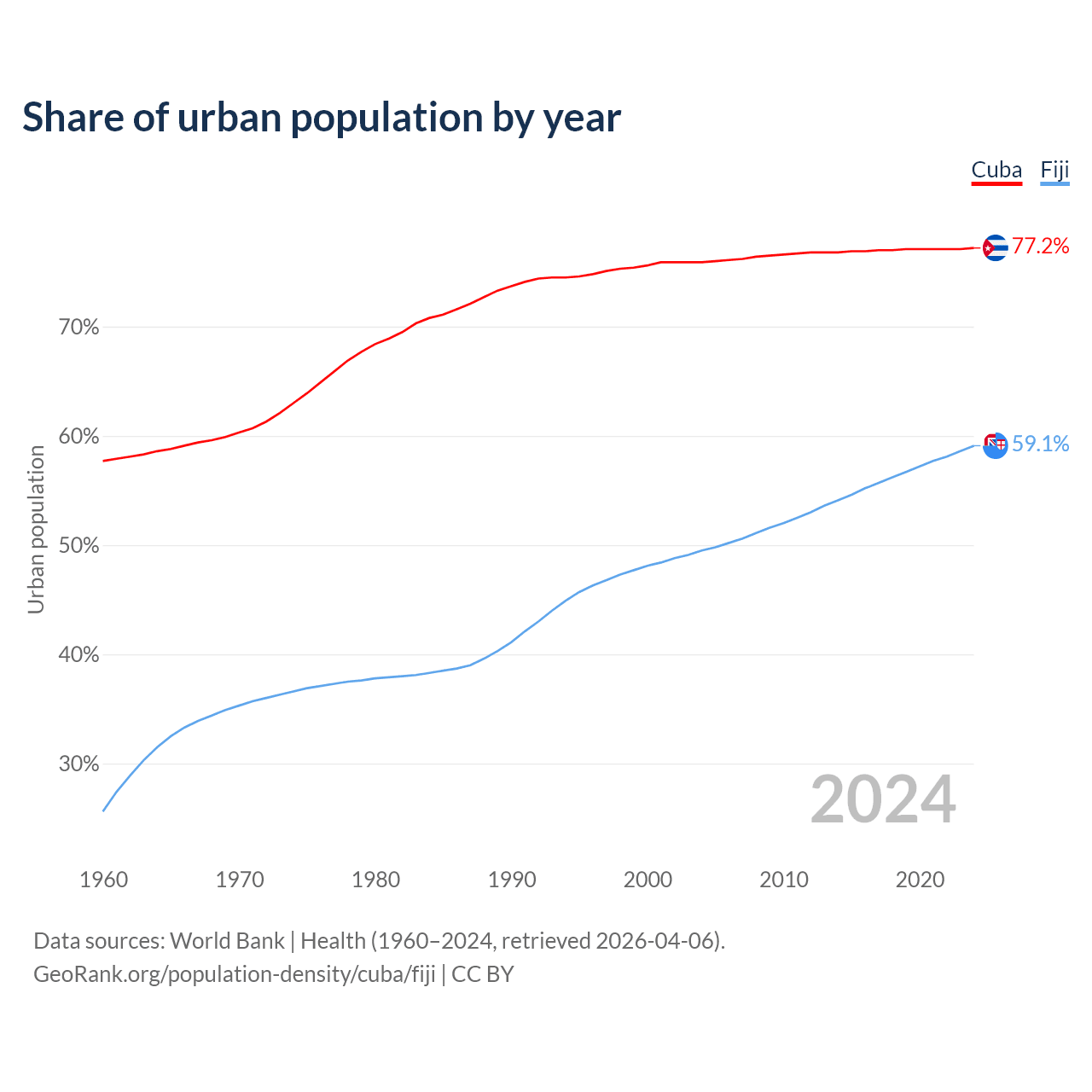 From 2004 to 2024, the share of urban population changed from 75.9% to 77.2% in Cuba and from 49.5% to 59.1% in Fiji.