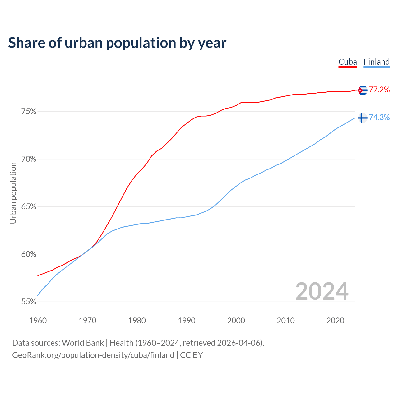 From 2004 to 2024, the share of urban population changed from 75.9% to 77.2% in Cuba and from 68.3% to 74.3% in Finland.