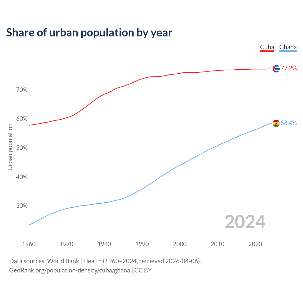 From 2004 to 2024, the share of urban population changed from 75.9% to 77.2% in Cuba and from 46.8% to 58.4% in Ghana.