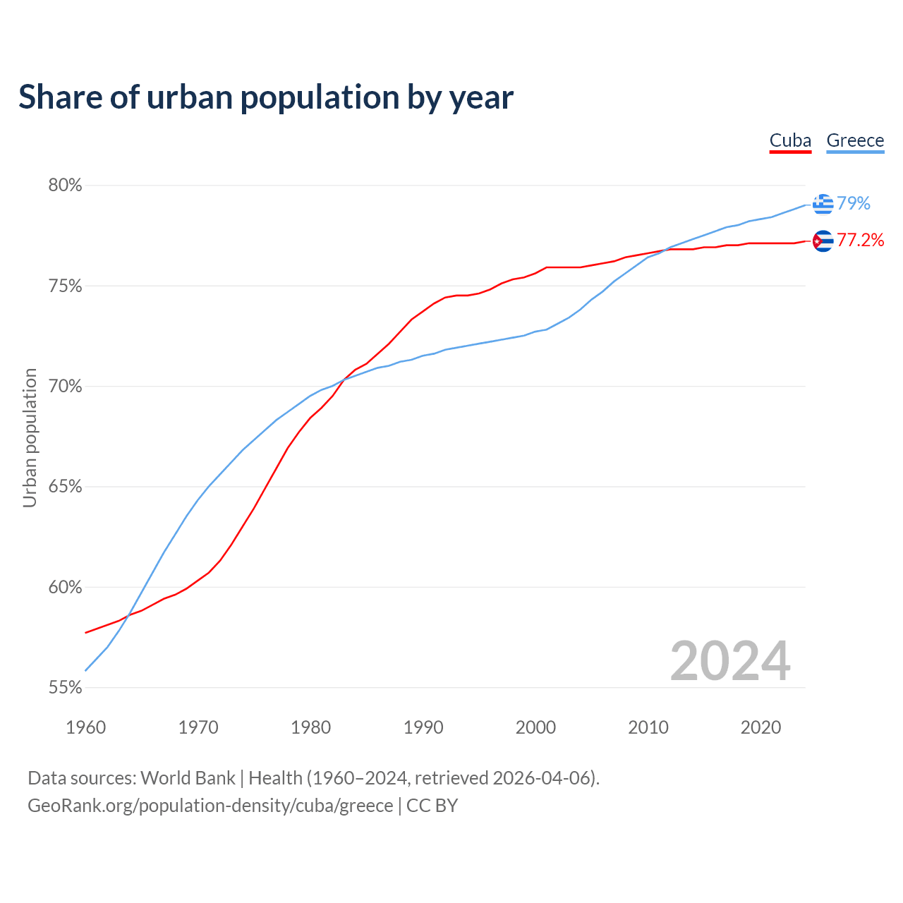 From 2004 to 2024, the share of urban population changed from 75.9% to 77.2% in Cuba and from 73.8% to 79% in Greece.