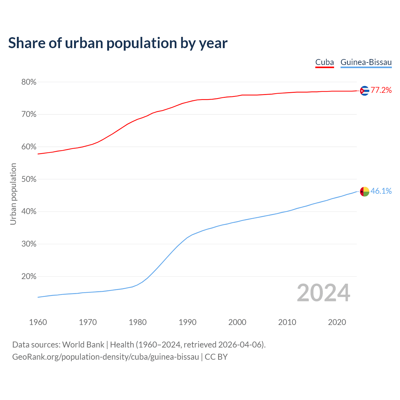 From 2004 to 2024, the share of urban population changed from 75.9% to 77.2% in Cuba and from 38.1% to 46.1% in Guinea-Bissau.