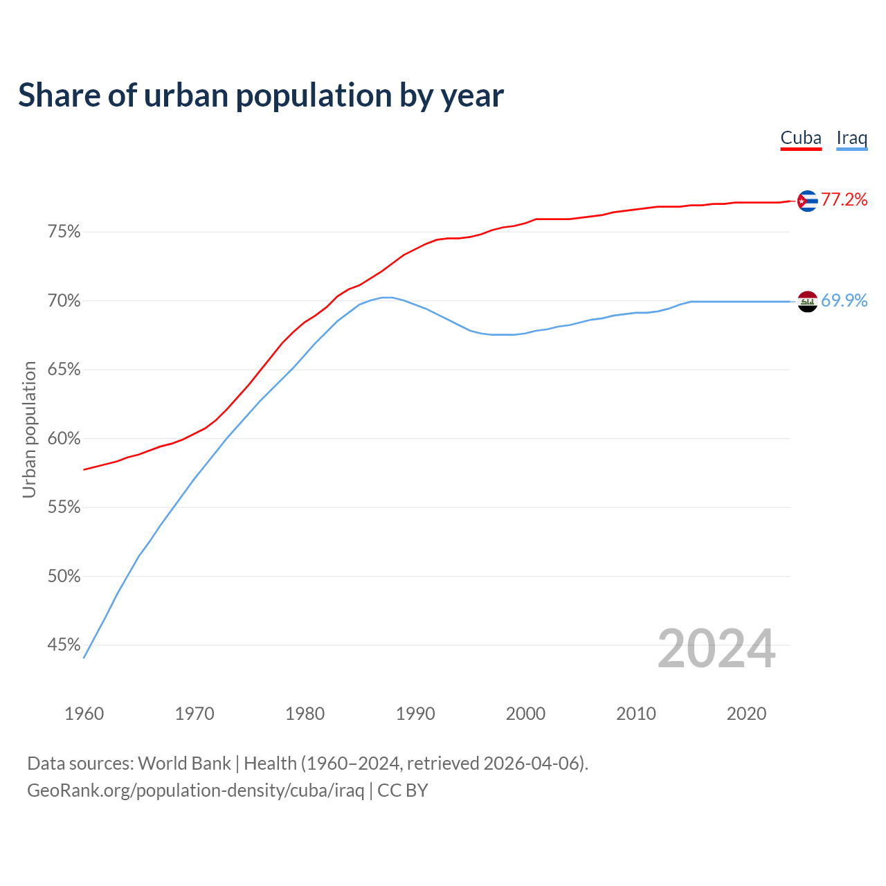 From 2004 to 2024, the share of urban population changed from 75.9% to 77.2% in Cuba and from 68.2% to 69.9% in Iraq.