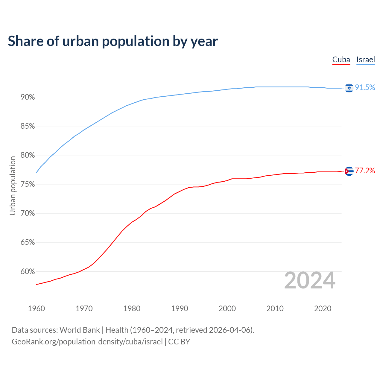 From 2004 to 2024, the share of urban population changed from 75.9% to 77.2% in Cuba and from 91.6% to 91.5% in Israel.