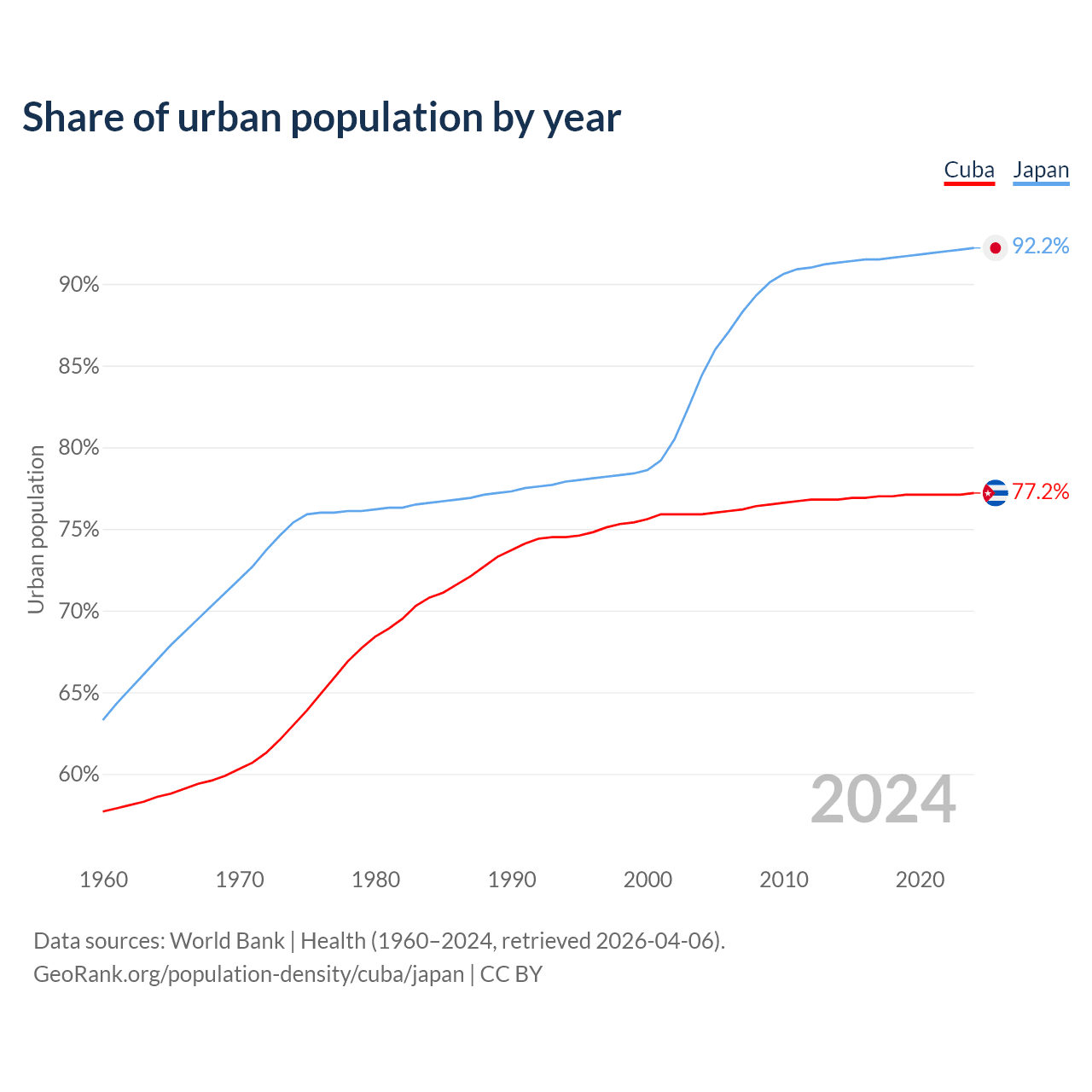 From 2004 to 2024, the share of urban population changed from 75.9% to 77.2% in Cuba and from 84.4% to 92.2% in Japan.