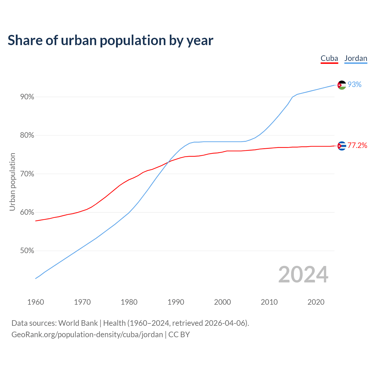 From 2004 to 2024, the share of urban population changed from 75.9% to 77.2% in Cuba and from 78.3% to 93% in Jordan.