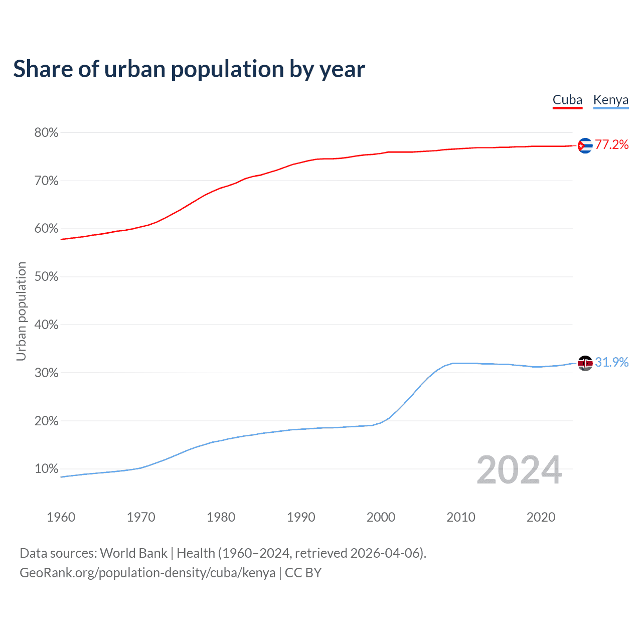 From 2004 to 2024, the share of urban population changed from 75.9% to 77.2% in Cuba and from 25.4% to 31.9% in Kenya.