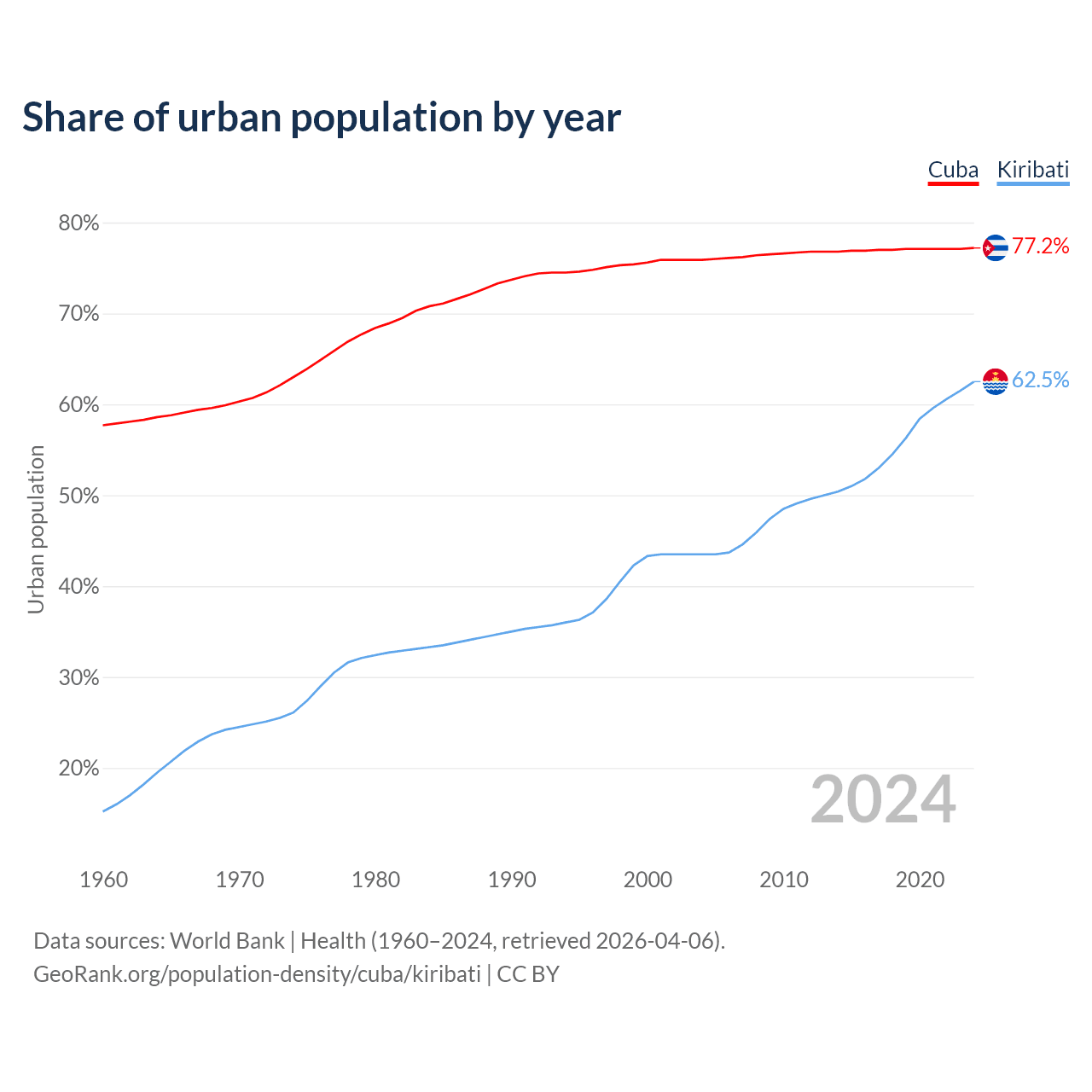 From 2004 to 2024, the share of urban population changed from 75.9% to 77.2% in Cuba and from 43.5% to 62.5% in Kiribati.